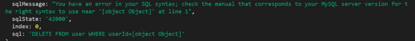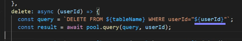 "" 쌍따옴표를 붙여주지 않으면 mysql이 문자열로 인지하지 못해서 userId가 해당 값인 특정 컬럼을 불러오지 못한다.