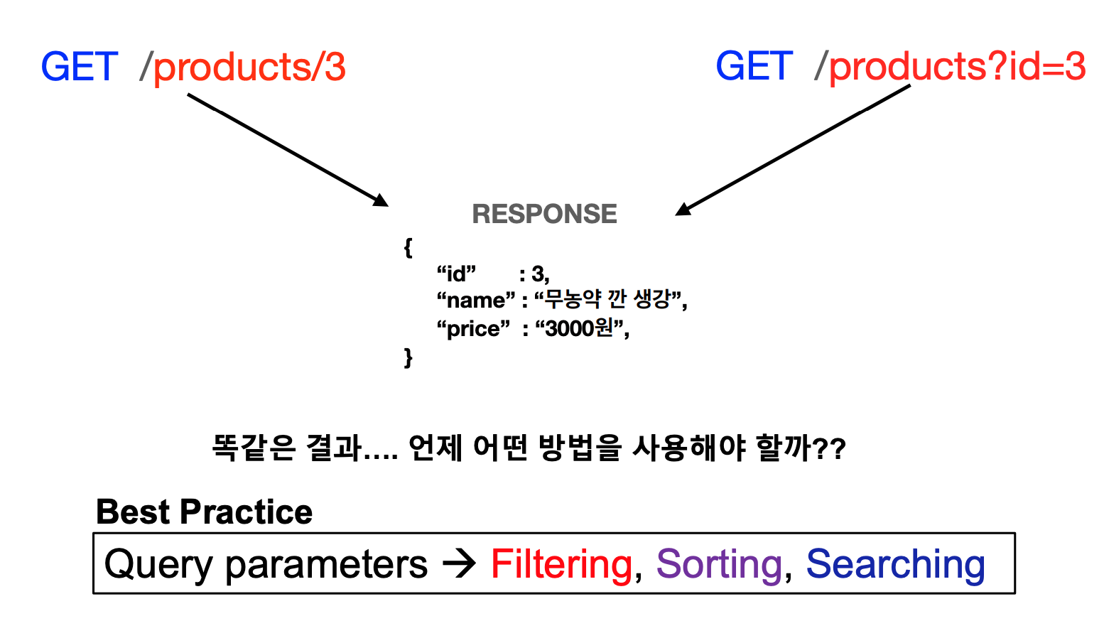 가끔 path 파라미터와 query 파라미터 중 무엇을 사용할지 고민하곤 하는데, REST API의 모범을 준수하자면 path 파라미터는 특정 리소스를 정의할 필요가 있을 때, query 파라미터는 정렬 혹은 필터링이 필요할 때 사용한다.