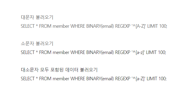 대문자 불러오기 SELECT * FROM member WHERE BINARY(email) REGEXP '^[A-Z]' LIMIT 100; 소문자 불러오기 SELECT * FROM member WHERE BINARY(email) REGEXP '^[a-z]' LIMIT 100; 대소문자 모두 포함된 데이터 불..